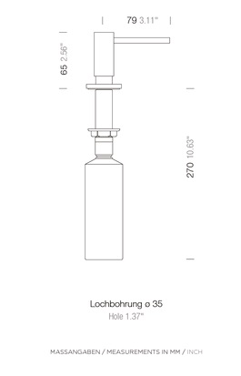 Dozirnik tekočega mila se lahko montira na katerokoli korito ali drugam, kjer je zagotovljena odprtina za montažo premera 35 mm in maksimalna debelina materiala 43 mm.