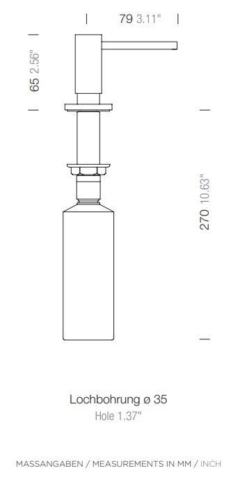Dozirnik tekočega mila se lahko montira na katerokoli korito ali drugam, kjer je zagotovljena odprtina za montažo premera 35 mm in maksimalna debelina materiala 43 mm.