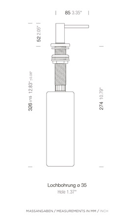 Dozirnik tekočega mila se lahko montira na katerokoli korito ali drugam, kjer je zagotovljena odprtina za montažo premera 35 mm in maksimalno debelino materiala 43 mm.