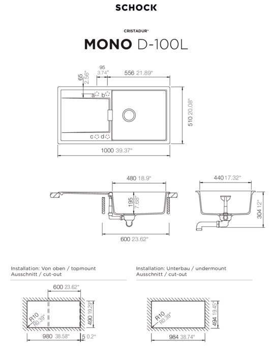 Pomivalno korito Schock model Mono D100 L je korito z XXL posodo. Vsebuje mehanizem za avtomatsko odpiranje izliva. lahko pa ga opremite z gumbom na dotik za odpiranje izliva in led razsvetlavo.