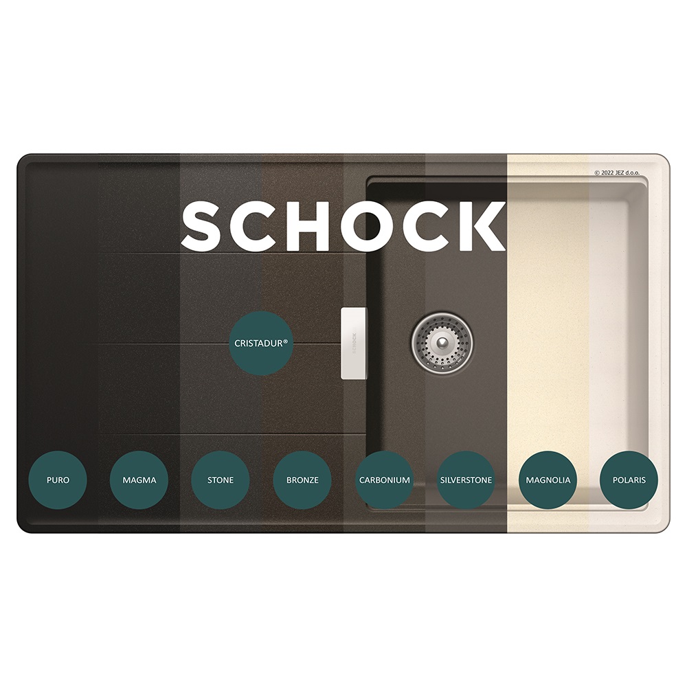 Pomivalno korito SCHOCK model Tia D-100 je preprosto kamnito korito z veliko posodo ter odcejalnikom. V posodo korita lahko vgradite LED luči, čudovito pa se mu poda tudi kuhinjska armatura SCHOCK Dion. Korito odlikuje prestižni material linije Cristadur® in v tej temni barvi Carbonium se bo lepo umestilo v vsako kuhinjo. Korito lahko opremite še z dodatki kot so izlivno prelivna garnitura v različnih barvnih obdelavah, rezalna deska, cedilo, dizajnerski odcejalnik iz plemenitega jekla, gumb za avtomatsko odpiranje in zapiranje izliva, grelnik odcejalnika ter dozirnik za milo.