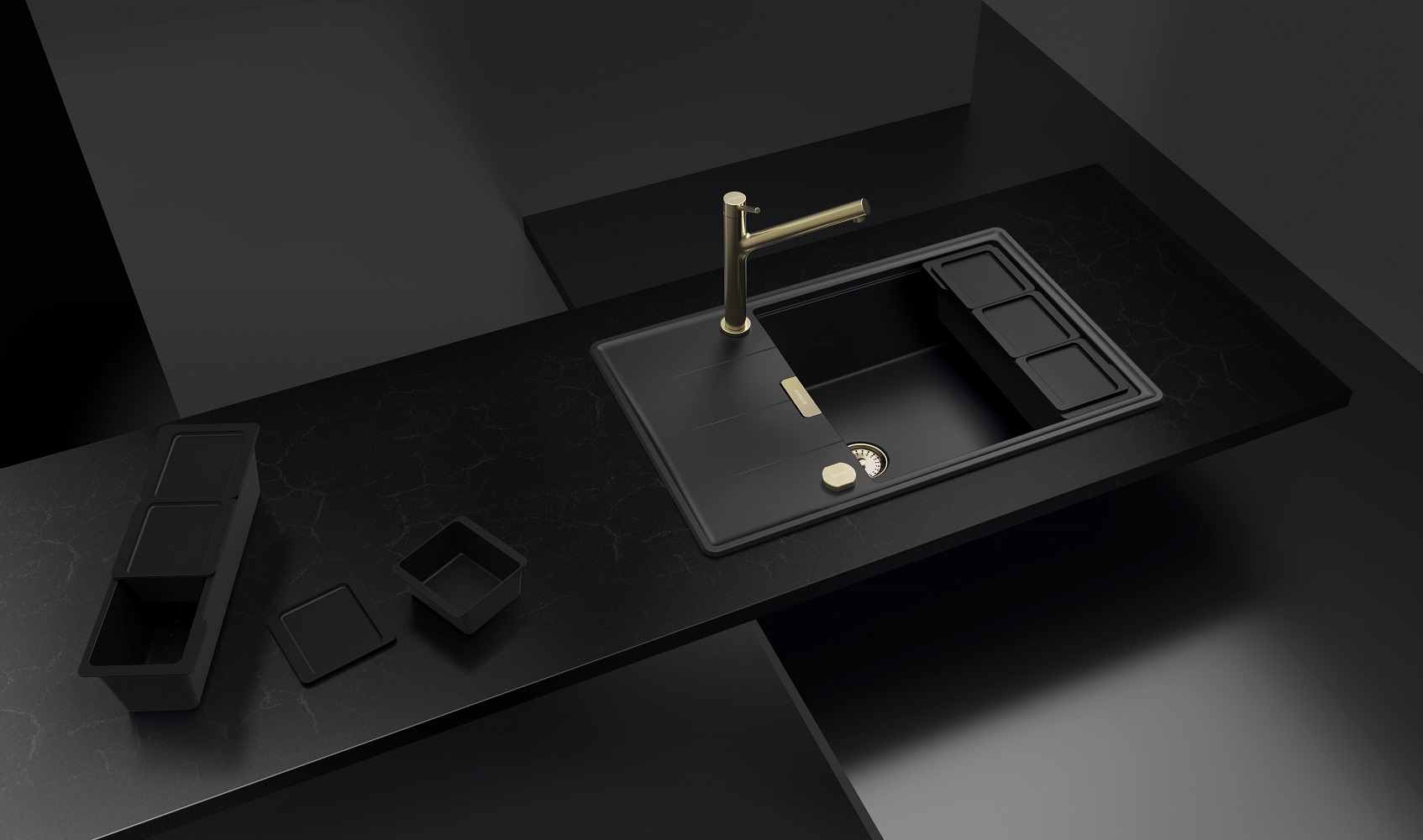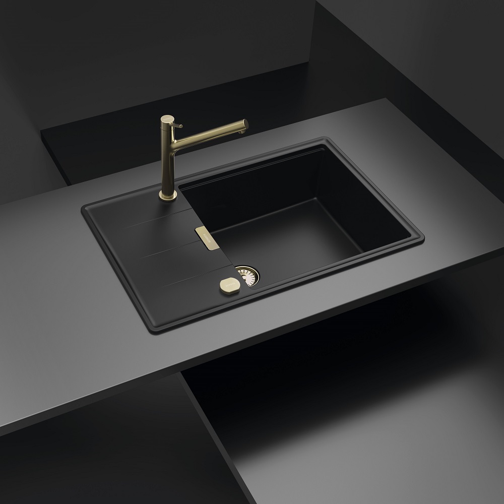 Korito prihaja iz prestižne linije Cristadur® in v tej črni barvi Puro se bo lepo umestilo v vsako kuhinjo. Koritu lahko dodate še druge dodatke kot so izlivno prelivna garnitura v različnih barvnih obdelavah, nosilec s posodo in/ali cedilom, rezalna deska, dizajnerski odcejalnik iz plemenitega jekla, gumb za avtomatsko odpiranje in zapiranje izliva ter dozirnik za milo.
