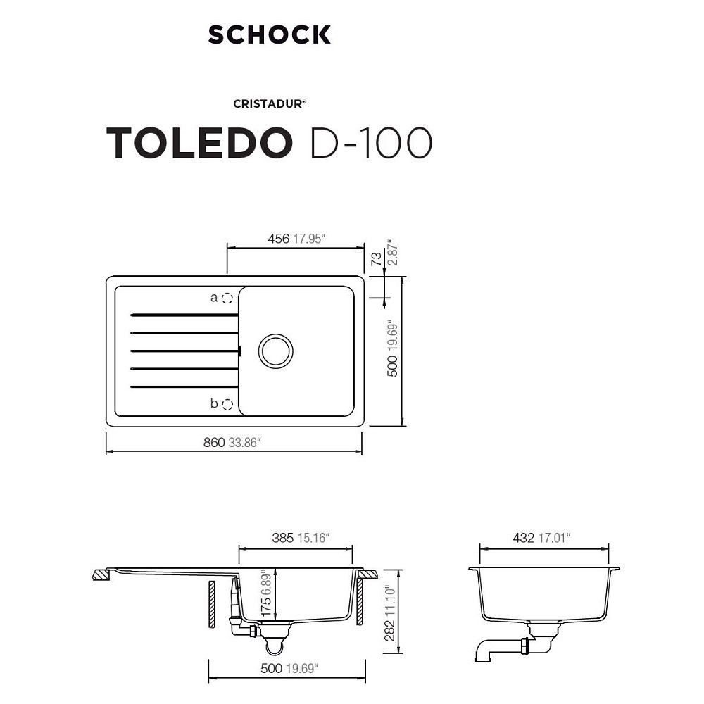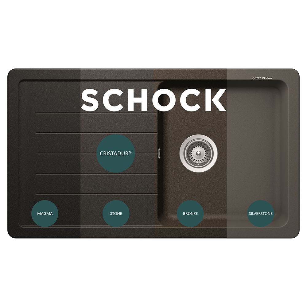 Pomivalno korito SCHOCK model Toledo D-100 je novost med kamnitimi pomivalnimi koriti. Poleg te temne barve Bronze, je korito dobavljivo še v treh drugih barvah. Gre za korito s plitko posodo in klasičnim odcejalnikom, je poljubne izvedbe, da ga lahko poljubno obrnete. Korito spada v prestižno linijo Cristadur®, zato se mu lepo poda kuhinjska armatura SCHOCK Conos, lahko pa ga opremite tudi z izlivno prelivno garnituro v različnih barvnih obdelavah, dizajnerskim odcejalnikom iz plemenitega jekla, rezalno desko ter dozirnikom za milo.